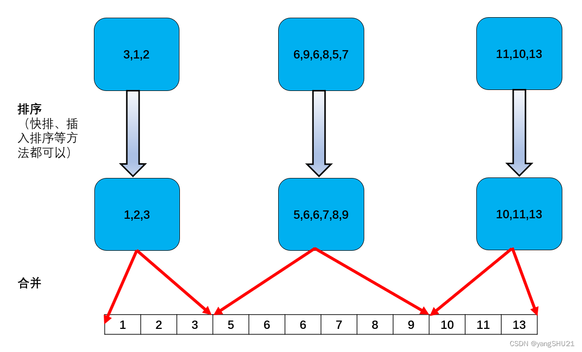 现在对每个桶内的元素单独进行排序,完成后并合并这些排序后的元素