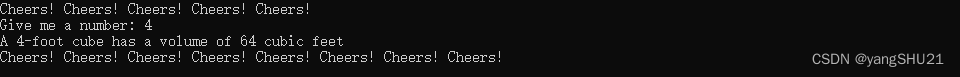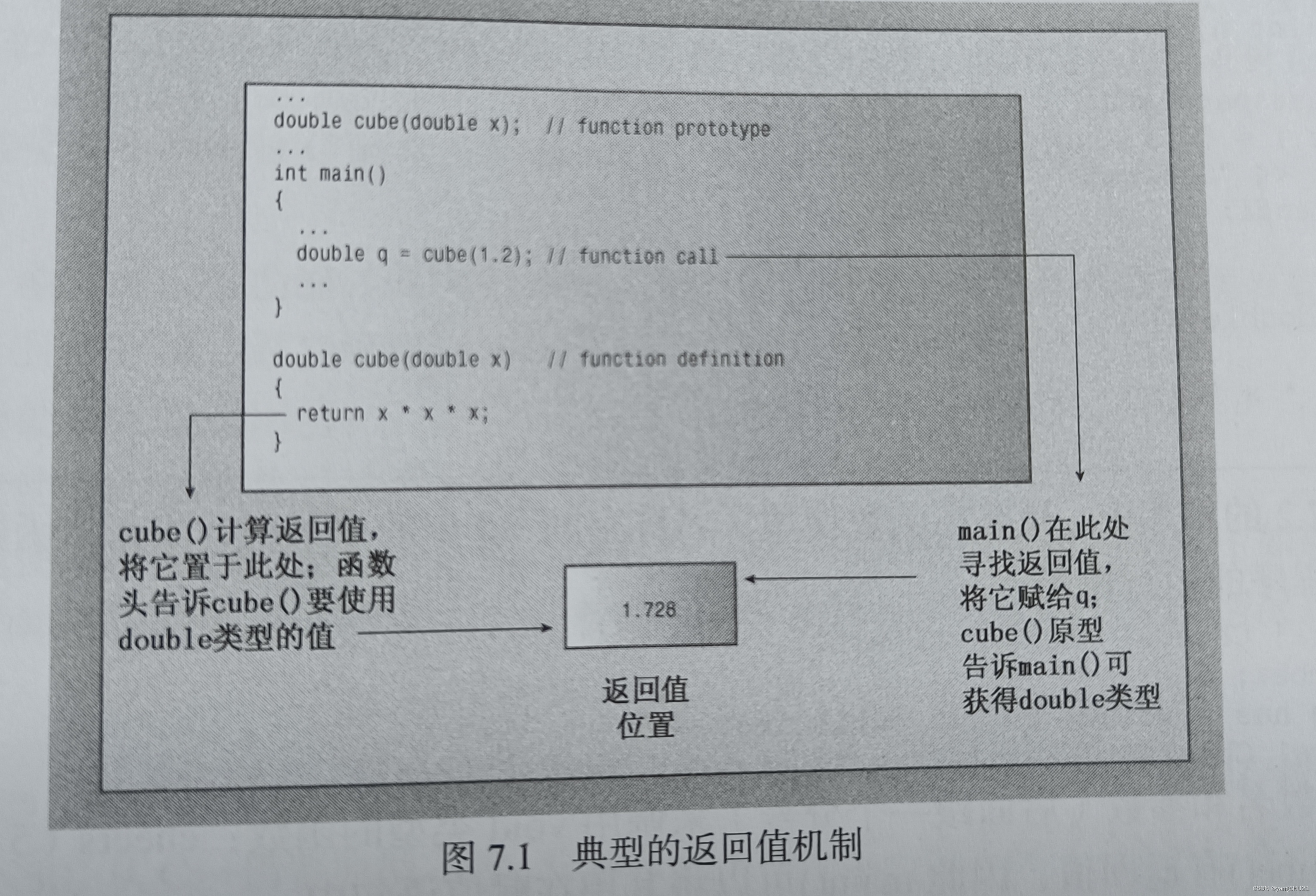对于上面这条语句,函数原型告诉编译器,cube()有一个double参数。如果程序没有提供这样的参数,原型将让编译器能够捕获这种错误;其次,cube()函数完成计算后,将把返回值放在指定的位置,然后调用函数(这里是main()函数)将从这个指定位置取得返回值。由于原型指出了cube()的返回类型是double,因此编译器知道应该检索多少字节以及如何解释它们。如果没有这些信息,编译器将只能进行猜测,而编译器是不会这样做的。