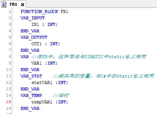 临时变量最简单,先讨论临时变量。临时变量类似解几何题的辅助线。有没有辅助线,有何种辅助线对解题没有本质影响。在OOP或者非OOP编程中,临时变量的表现也是一样的。临时变量都是函数的伴生物,FB中的临时变量也不例外,它们是FB中代码的伴生物,FB中的代码可以视为一个函数。临时变量是存储在栈中,跨扫描周期读取数据时数值会变化,也不能被外部访问。这些都与SIMATIC中的临时变量表现一致。临时变量讨论完毕,下文只讨论其他3种变量。