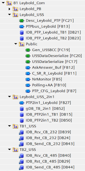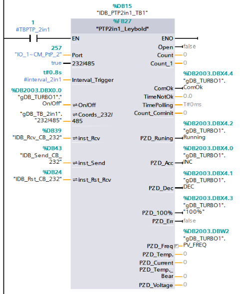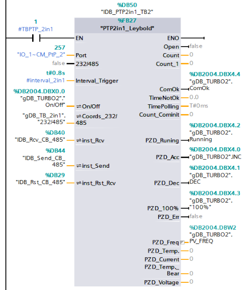 Leybold_USS_2in1这个文件夹是这次编写的,用于一个PTP模块对应2个泵通讯的程序。其中的一个FB是主要FB,PTP2in1_Leybold。这个FB中程序相对简单。这个块中主要调用了 Leybold_USS这个文件夹中的内容。这也是我之前强调的编程要分层次。虽然有些繁琐,但是好处很多。在实现2in1的功能时,80%的程序是之前1to1模式时编写的。当需要2in1模式时,直接拿来用就可以了。
