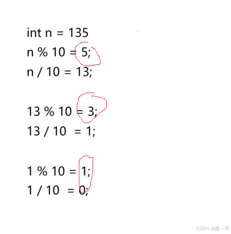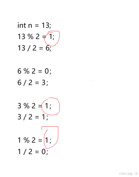 由上图可知,我们的主要过程是进行了一个先 %2 再 /2 的操作。相比于我们日常生活中的10进制,我们想得到一个数的每一位(如上图n=135),我们是先 %10 得到个位,然后 n = n /10;之后再 %10 得到十位,n = n / 10;最后再 %10得到百位。那么相比较与计算机的存储,我们所存储的是二进制的补码,所以我们就需要进行如上图(n=13),我们先 %2得到32位中的第一位,如果得到的是1,就说明这一位就是1,然后 n = n / 2;接着再 %2,得到第二位,再 n = n /2;反复进行此操作,直到 n的值变为0为止。
