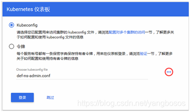 将/root/def-ns-admin.conf文件发送到宿主机,浏览器访问时选择Kubeconfig认证,载入配置文件,登陆,即可实现访问,如图: