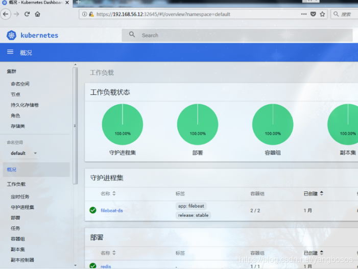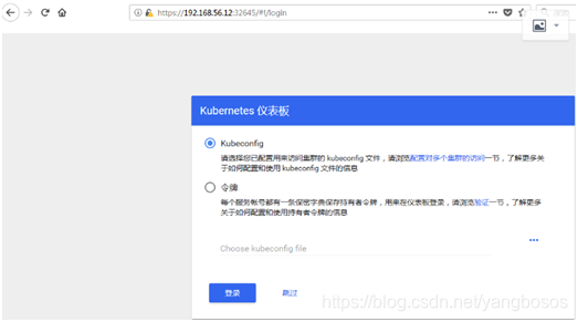 浏览器访问:https://192.168.56.12:32645,如图:这里需要注意的是谷歌浏览器会禁止不安全证书访问,建议使用火狐浏览器,并且需要在高级选项中添加信任