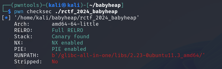可以看到,保护全开,我这里用patchelf连接了题目的版本,但题目的版本不是纯的2.23-0ubuntu11.3版本,我自己去下了个题目的版本,这里有点坑。。(可以自己去buu上面找链接)