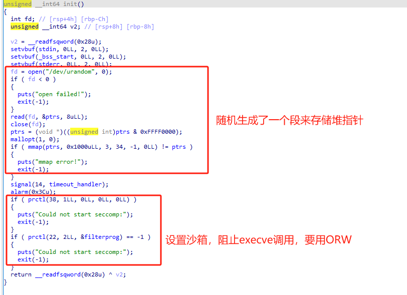 可以看到在init函数中初始化了堆指针存放段,还加了沙箱保护,阻止了execve调用,one-gadget失效,system("/bin/sh")也失效了,所以考虑用ORW(open,read,write) 直接去读取flag。值得注意的是,mallopt(1,0)禁用了fastbin(即global_max_chunk=0x10)