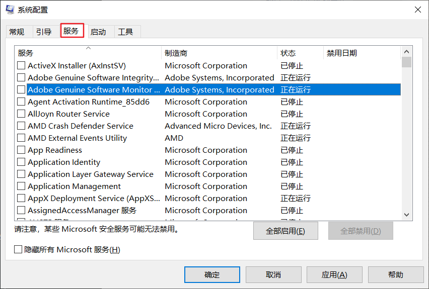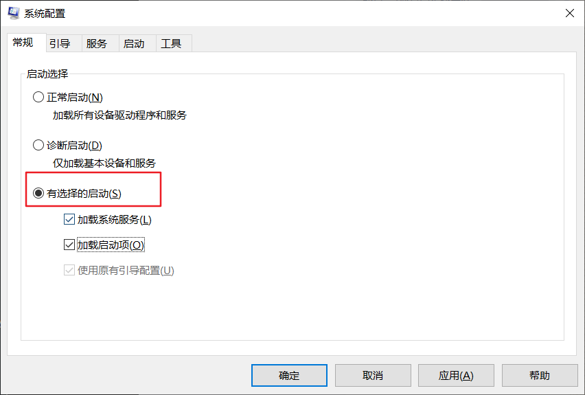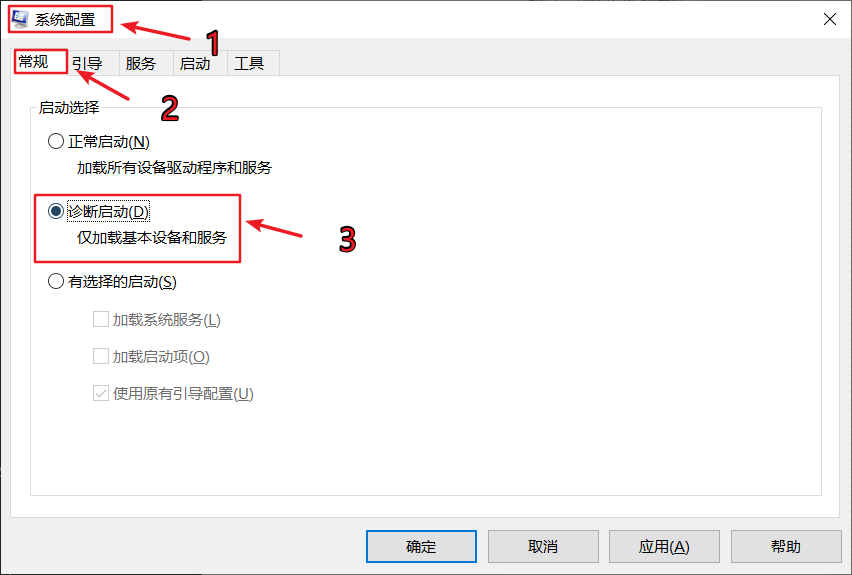 先选择 常规选项卡下的 诊断启动 (仅加载基本设备和服务) ,重启后发现不再闪屏了,把出错的服务禁用掉即可解决问题,接下来就是排查到底是哪个服务导致的问题