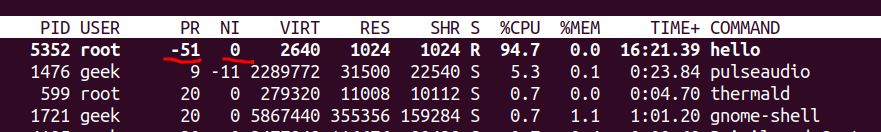 top 在普通进程default PR值是20, 根据nice值做调整,PR取值范围在0~39, 但是在表示rt thread时,全部都是负值, 为-1-rt, 从 -2 ~ -99(这里你会有疑问,rt的值是1~99,还有一个-100怎么没有?实际当rt=99时,这里的PR会显示rt)