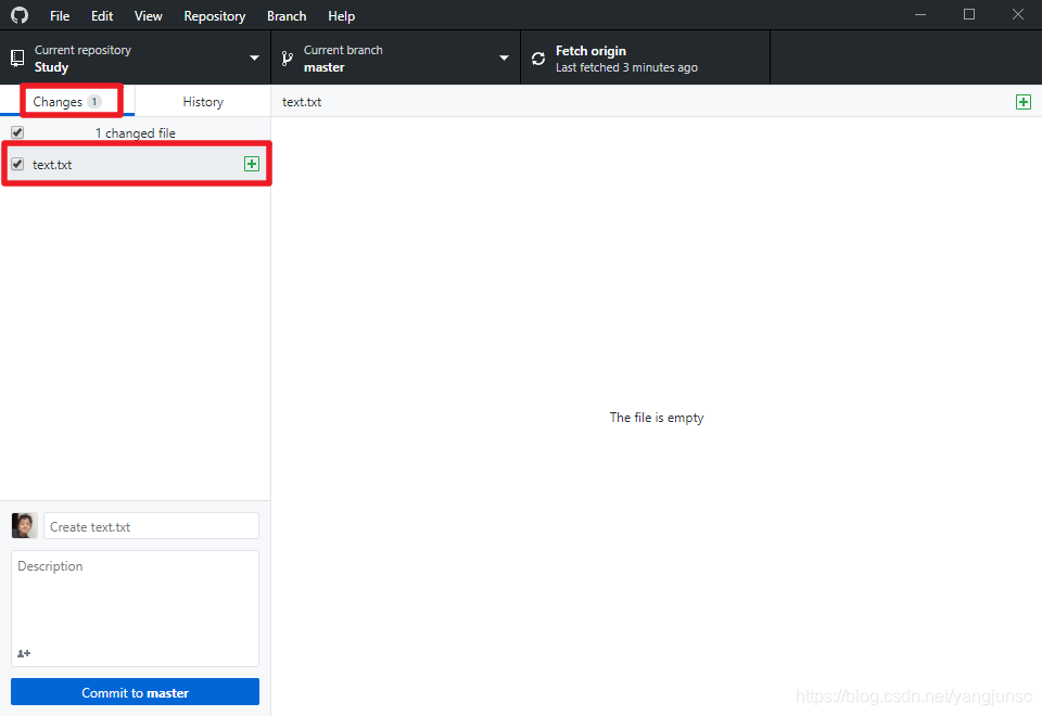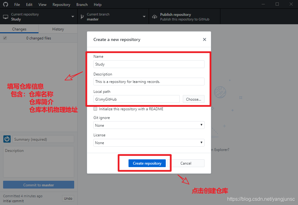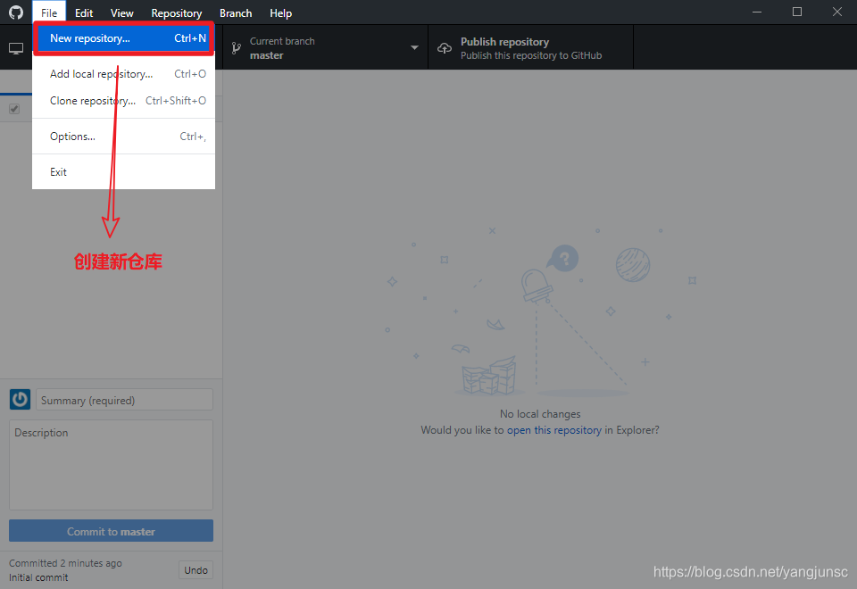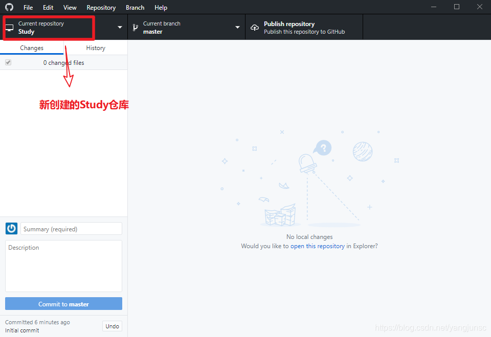 11、点击"Commit to master"只是让Github客户端记录这次进行的改动,相当于一次游戏存档,在将来的某一天如果想重玩这个存档,可以点击上面的圆圈“读取存档”,让项目恢复到这次记录的状态。