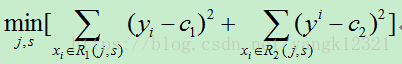 其中c1,c2分别为R1,R2区间内的输出平均值。(此处与统计学习课本上的公式有所不同,在课本中里面的c1,c2都需要取最小值,但是,在确定的区间中,当c1,c2取区间输出值的平均值时其平方会达到最小,为简单起见,故而在此直接使用区间的输出均值。