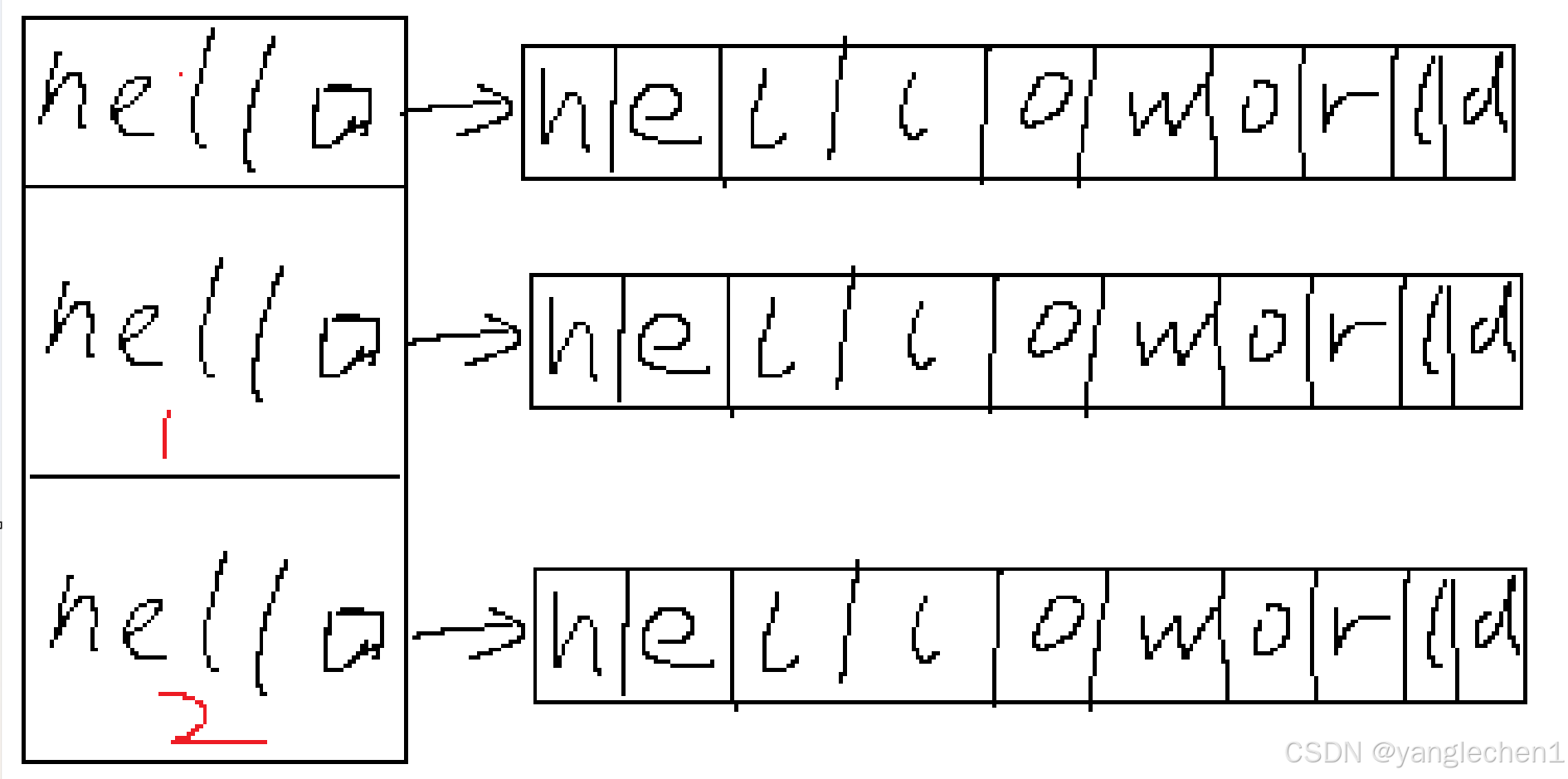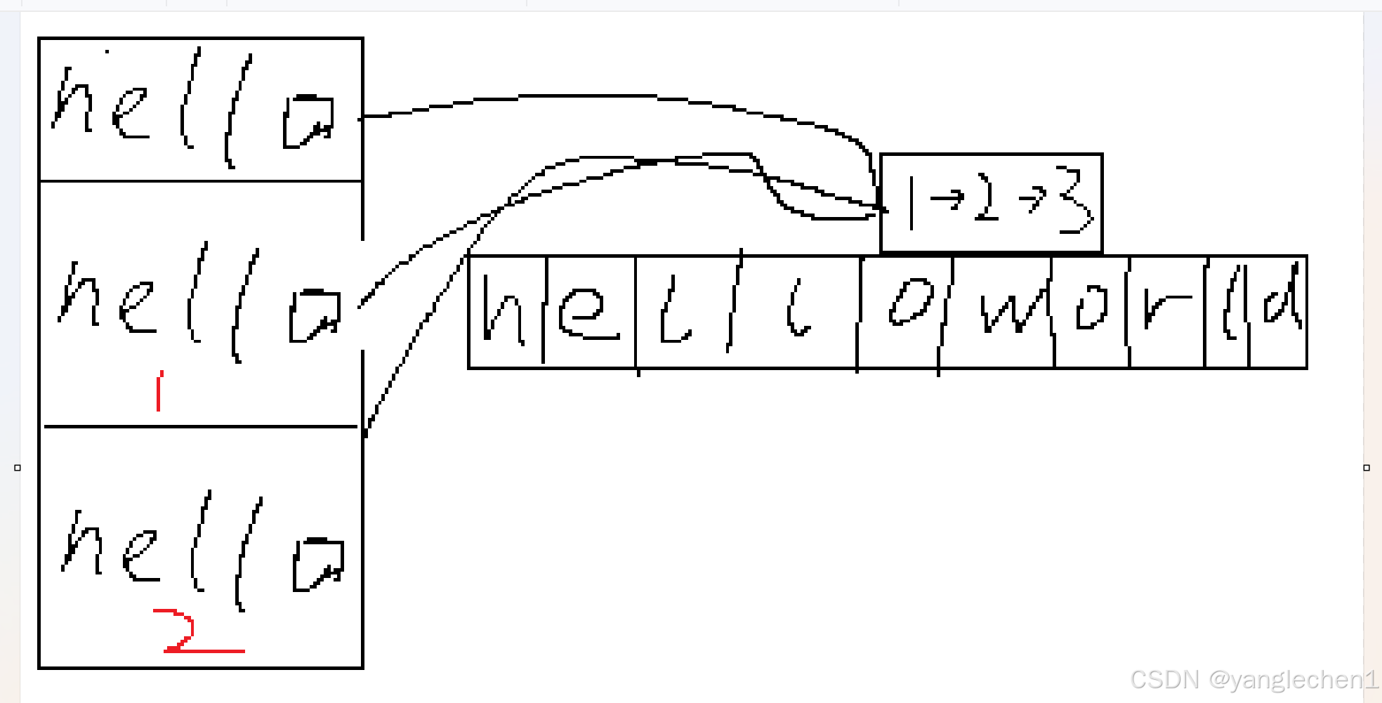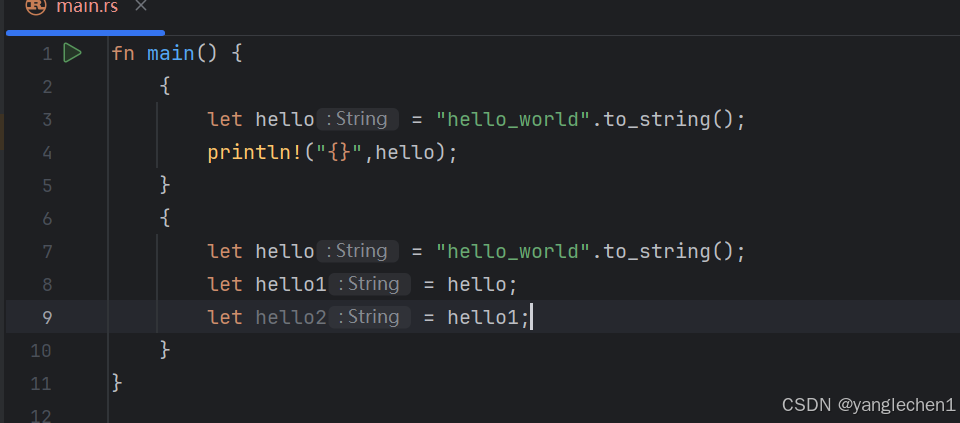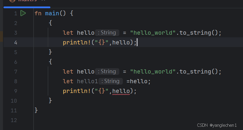 那么RUST呢。堆空间还是同一块,但是所有权已经变。因为共享的同一块内存,为了安全,牺牲了便利,这个时候,你的hello,hello就指向了空气。无法使用了。这就是所有权
