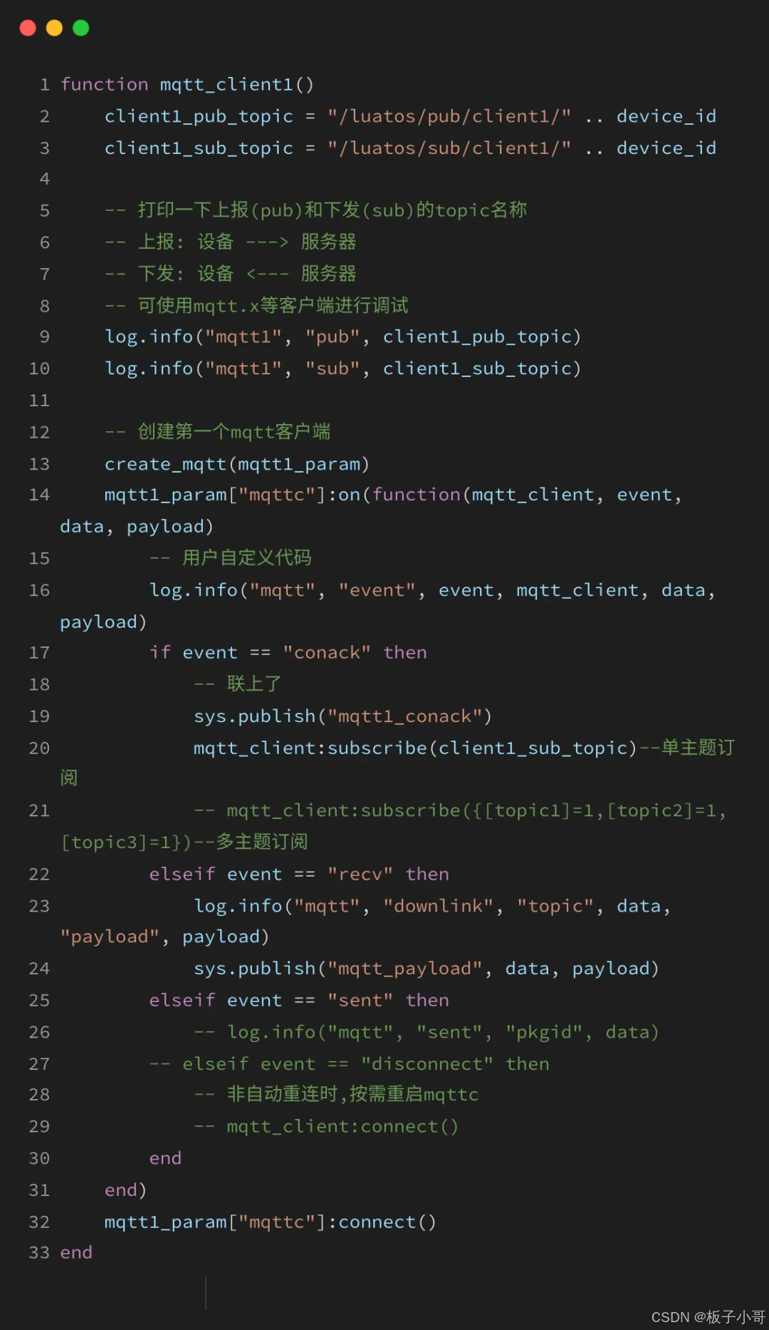 2)其余代码部分就与MQTT单链接示例中的single_mqtt.lua代码相同,为避免重复信息过多,影响阅读感受,大家可转到上文2.2 single_mqtt.lua说明进行了解。