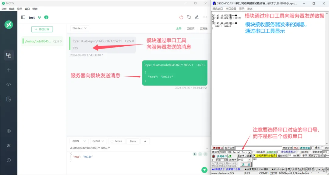 前面代码中所提到的mqtt-uart透传实现效果图如下所示: