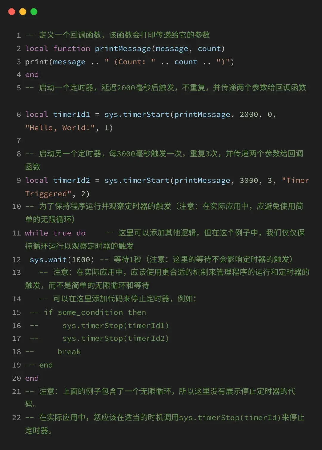 指定定时器是否重复触发。如果为0,则定时器只触发一次;如果为正整数,则定时器会重复触发指定的次数;如果为负整数(如-1),则定时器可能表示无限重复(具体取决于LuatOS的实现,但通常-1 用于无限循环)。