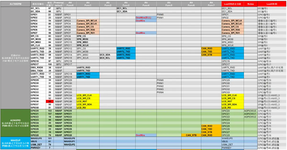 Air780E大部分管脚为普通GPIO(上图GPIO复用表格中灰色底色的IO);