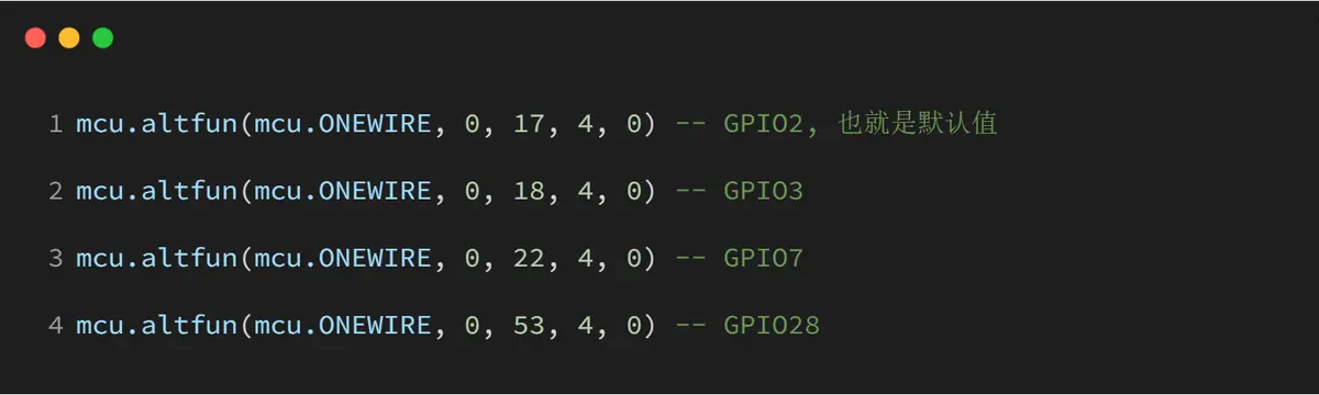 2、Air780EPM LuatOS OneWire 协议,虽然有 4 个管脚可以复用,但硬件通道只有 1 个,大家在设计时: