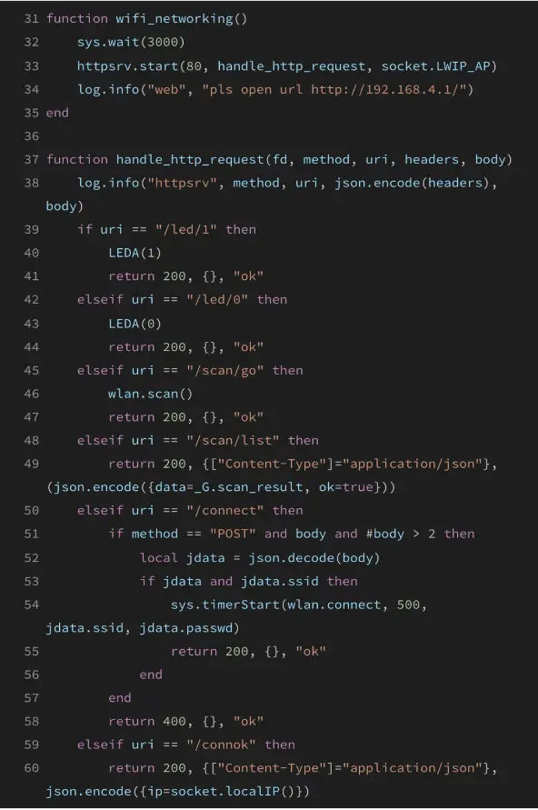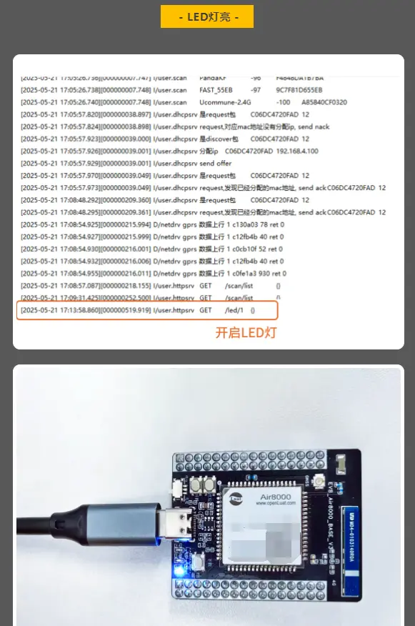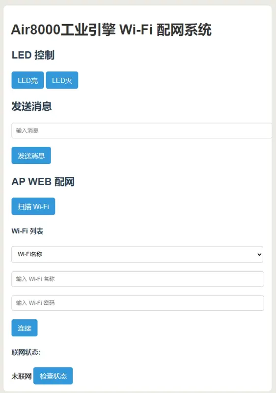 以Air8000核心板为例,用户可以在网页端通过HTTP请求控制LED的开关、发送任意消息、扫描可用的Wi-Fi网络、获取AP列表,以及连接到新的Wi-Fi网络。