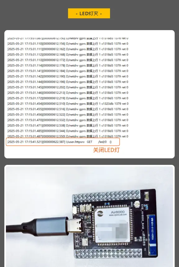 进入网页后通过按钮控制LED灯,可以在日志中看到如下打印及核心板实物LED亮灭。