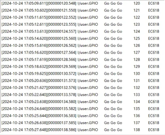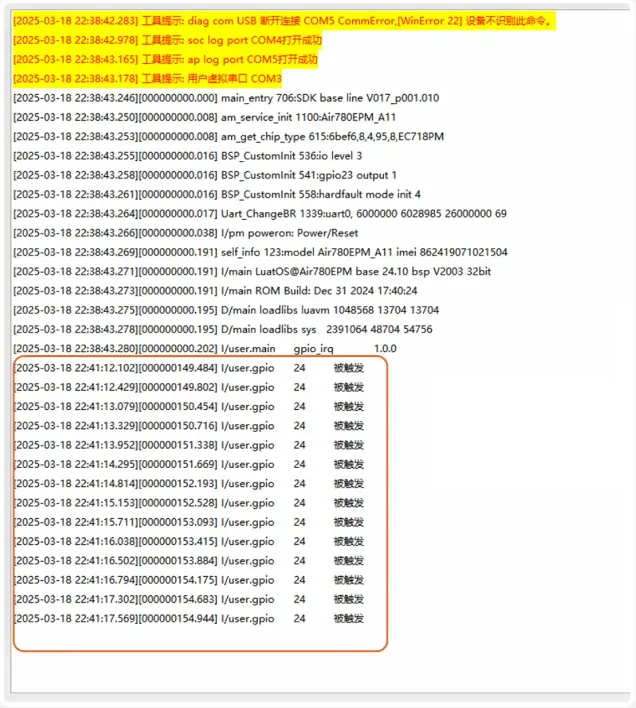 将Air780EPM开发板上的GPIO24引脚在插拔VDD-EXT之间来回切换,即可在日志中看到打印。当GPIO24接触高/低电平时,均会触发中断: