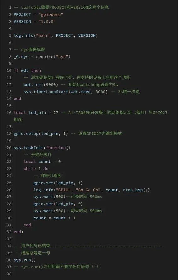 Air780EPM开发板上的网络指示灯(蓝灯)与GPIO27相连,将引脚初始化为输出,并周期性改变其电平,从而实现每隔1秒亮0.5秒的呼吸灯闪烁效果。