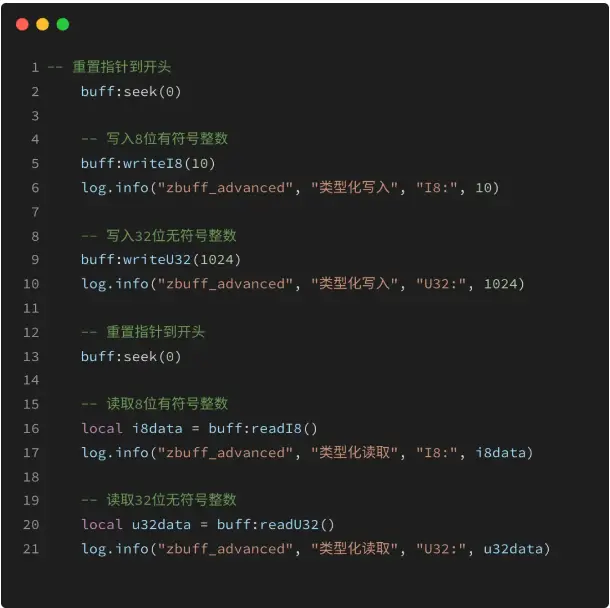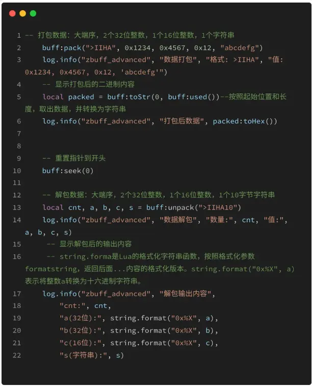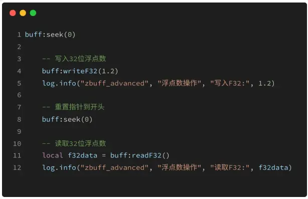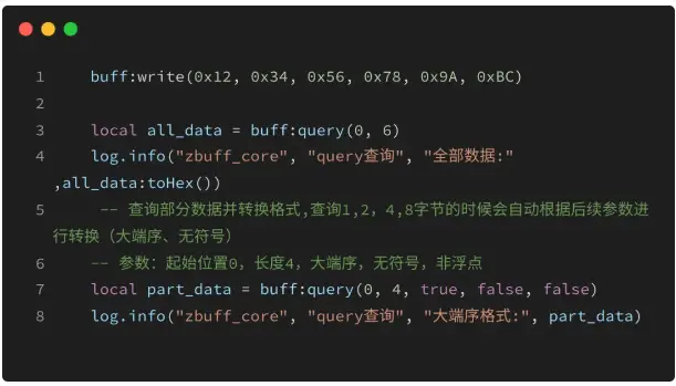 为什么用zbuff:传感器数据通常是小而频繁的二进制流,使用zbuff的readI16()等类型化读取接口,比手动拆解字符串更高效。