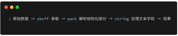 可以举一个实际协议解析的例子说明三者的协作关系,比如先通过zbuff接收原始数据,再用pack解析特定字段,最后用string处理文本部分。