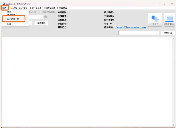 1)打开LuatTools,点击【账户】下拉菜单的【打开资源下载】选项: