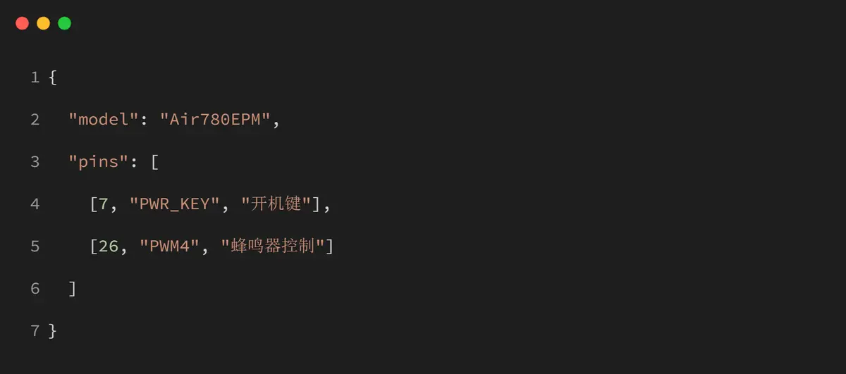 3, pins_Air780EPM.json 描述了本例使用到的管脚的功能,780EPM 的 26 管脚,用作 PWM4。