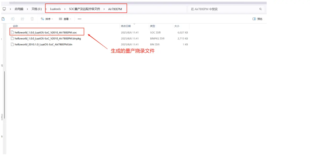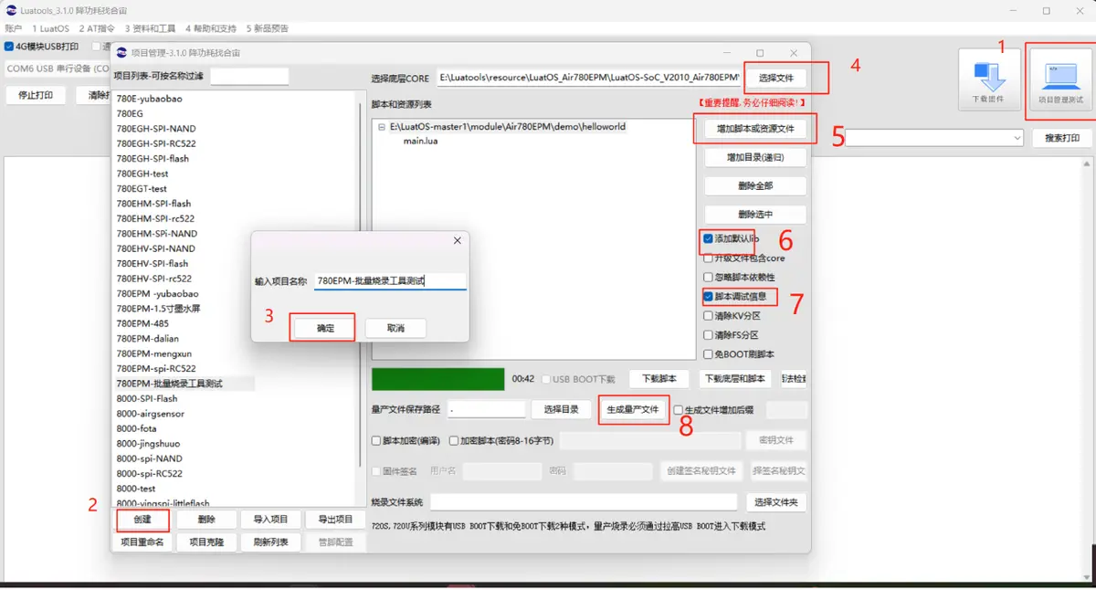运行 Luatools 工具,按下述步骤生成量产烧录文件,在 Luatools 安装路径的文件下找到生成的量产烧录文件。