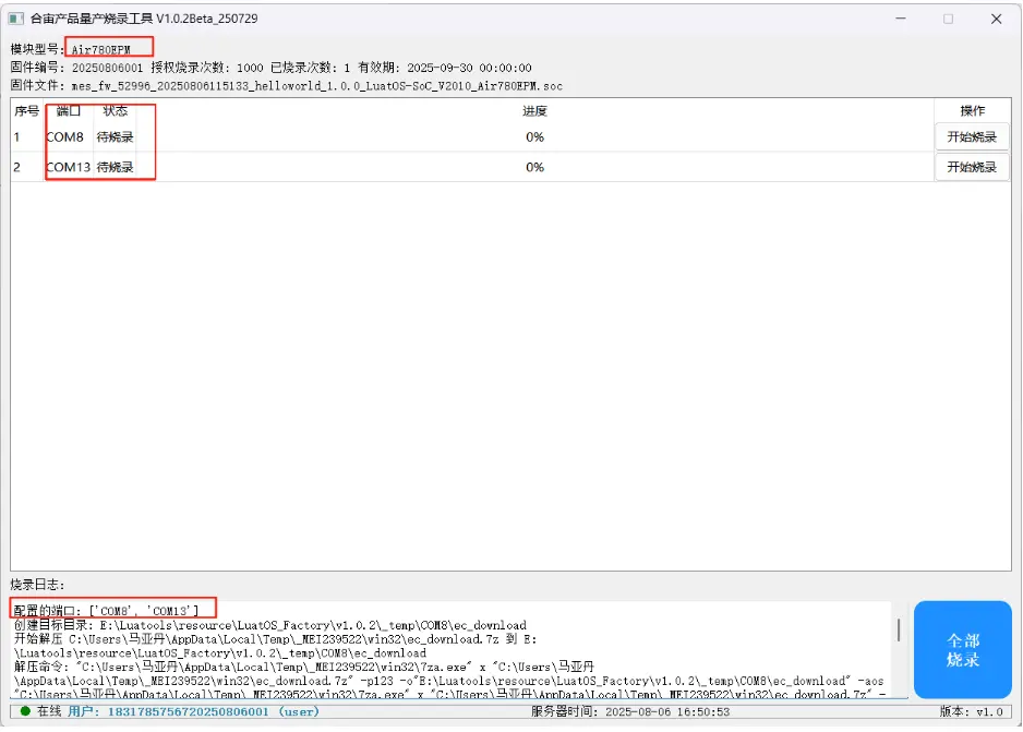 或者点击全部烧录,会烧录当前所有配置好的模组。