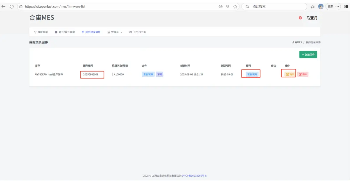 例如:第二章中注册登录 iot 的账号是 18317857567,创建的固件编码是 20250806001