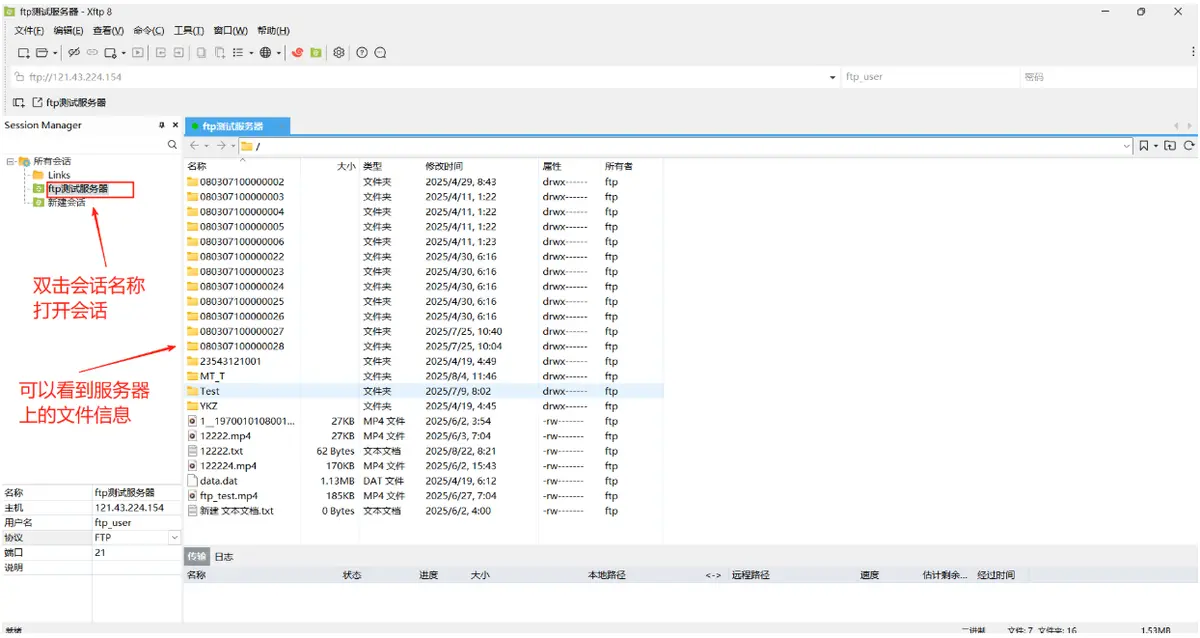注意选择 FTP 协议,如果新建会话后无法打开会话,可以再次检查登录信息是否正确。