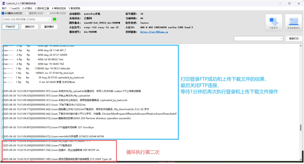 使用 Air780EPM 开发板下载 Air780EPM 的 LuatOS 示例代码中 ftp 的例程,进行验证,例程中实现的功能核心业务逻辑为: