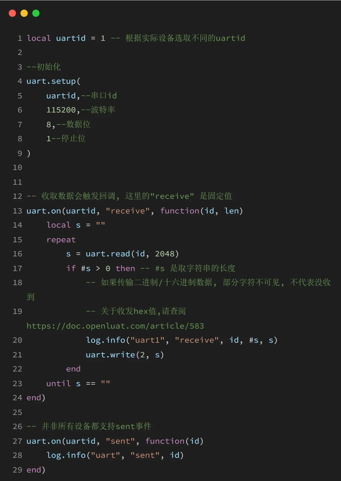 但是由于 Air8000 uart2 的 RX 被内部 Cat.1 芯片占用,无法直接发送命令给内部 GNSS 芯片,所以我们需要曲线救国一下,将 uart2 上的数据转发给 uart1,再将 uart1 收到的指令转发给 uart2,这样就能实现通过 uart1 给内部 GNSS 芯片发送指令,并且通过 uart1 观察 GNSS 芯片吐出的 NMEA 数据,来分析 Air8000 内部 GNSS 芯片性能的目的了