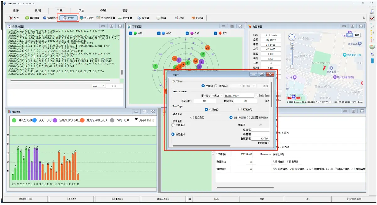 点击最上面一排工具栏中的"工具"选项,再在二级菜单中找到 TTFF 选项,点击后,会弹出如图所示的弹窗,看不清没关系,在弹窗的右上角选择放大该窗口