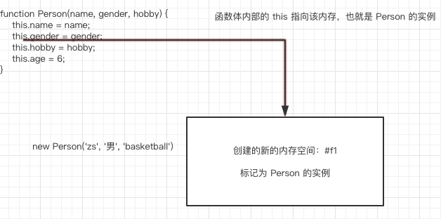 按照上面讲的,我们复习一遍。首先,当用 new 关键字调用时,产生一个新的内存空间 #f11,并标记为 Person1 的实例;接着,函数体内部的 this 指向该内存空间 #f11;执行函数体内部的代码;由于函数体内部的 this 指向该内存空间,而该内存空间又被变量 p1 所接收,所以 p1 中就会有一个 name 属性,属性值为 'zhangsan'。
