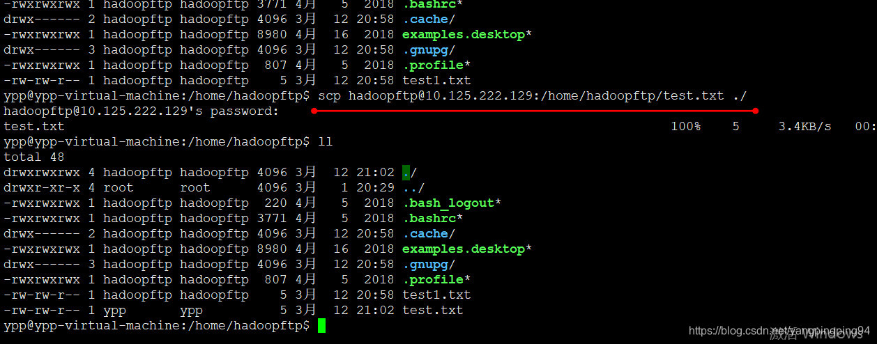 hadoopftp@10.125.222.129为下载服务器的用户名及ip地址, /home/hadoopftp/test.txt 为下载文件路径及文件名称