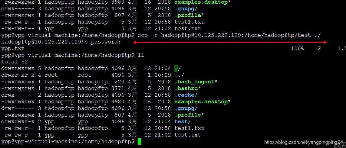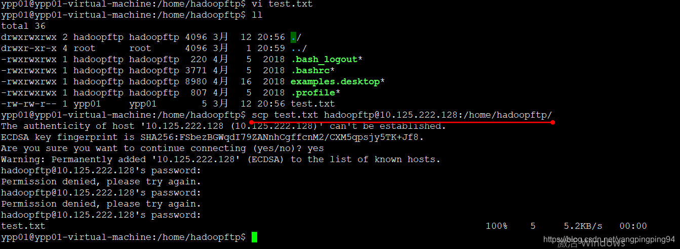 test.txt为需要上传的文件,hadoopftp@10.125.222.128 为上传的服务器用户名和ip地址,/home/hadoopftp/为上传远程目录