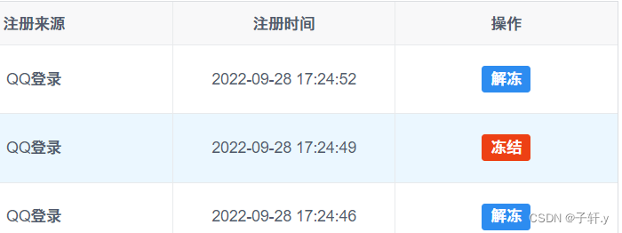 这段代码展示了如何在表格中根据用户的状态(userinfo_status)动态渲染按钮,当状态为1时显示‘解冻’按钮,背景色为蓝色;否则显示‘冻结’按钮,背景色为红色。点击按钮会触发frozen方法,传入用户ID和索引值。