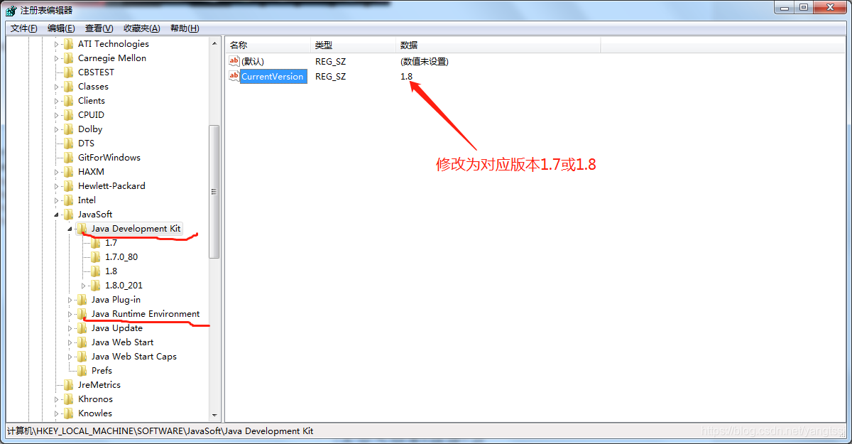 1. 在注册表下找到HKEY_LOCAL_MACHINE\SOFTWARE\JavaSoft文件夹下的Java Development Kit和Java Runtime Environment,点击这两个文件夹,右侧会有CurrentVersion,右键点击CurrentVersion可修改版本为1.7或1.8,这个版本必须和上述目录中的三个程序的版本一致,否则就会出现上述问题。