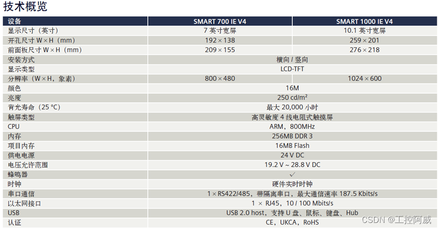 概述:西门子敏锐抓住广大工业用户的需求,推出新一代SIMATIC精彩系列面板-SIMATIC SMART LINE V4 通过与S7-200 SMART PLC协作,为广大的OEM用户提供灵活、高效、可靠并极具性价比的小型自动化解决方案。V4开孔尺寸与V3一致,无需改变机柜尺寸,且可完全兼容V3项目;与V3相比,V4性能大幅提升。