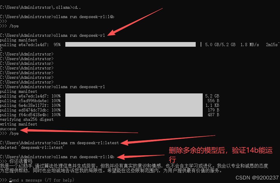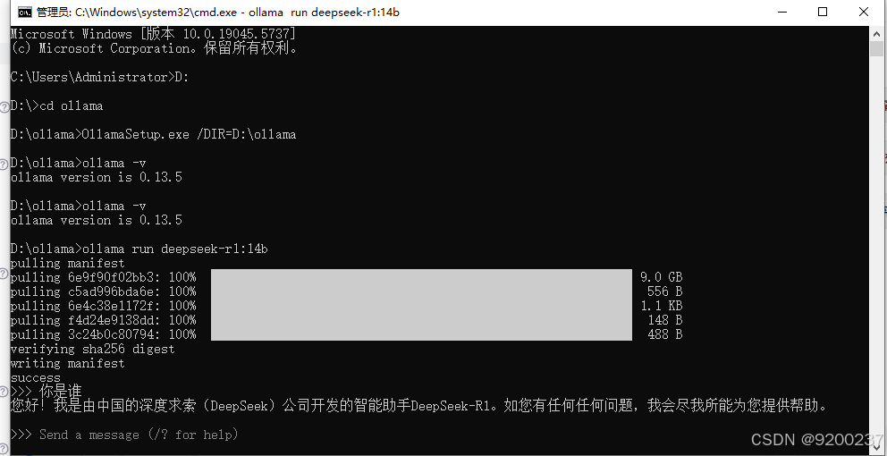 (3)ollama run 模型名称-版本号:大小,命令运行指定模型,比如:ollama run deepseek-r1:14b