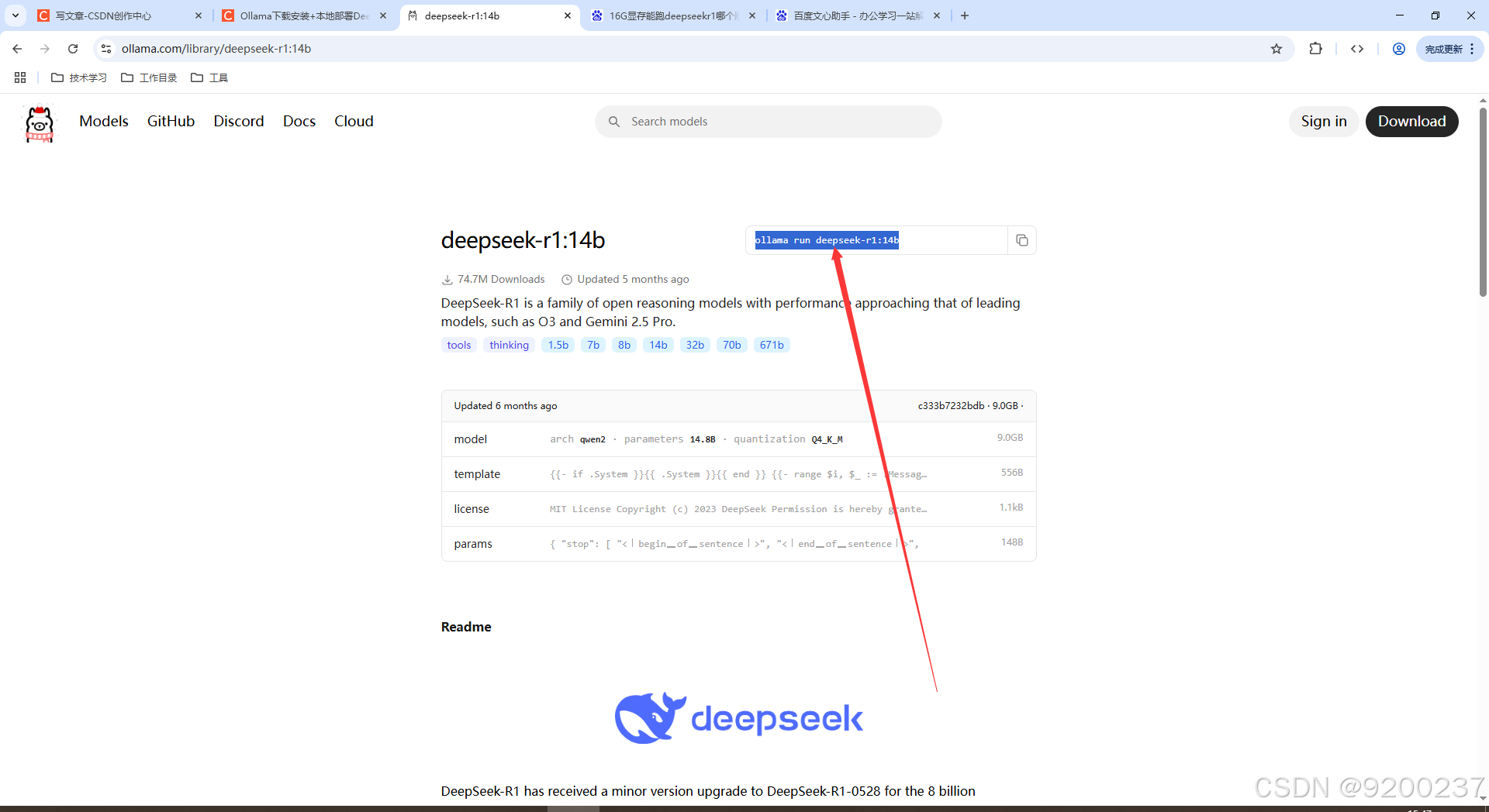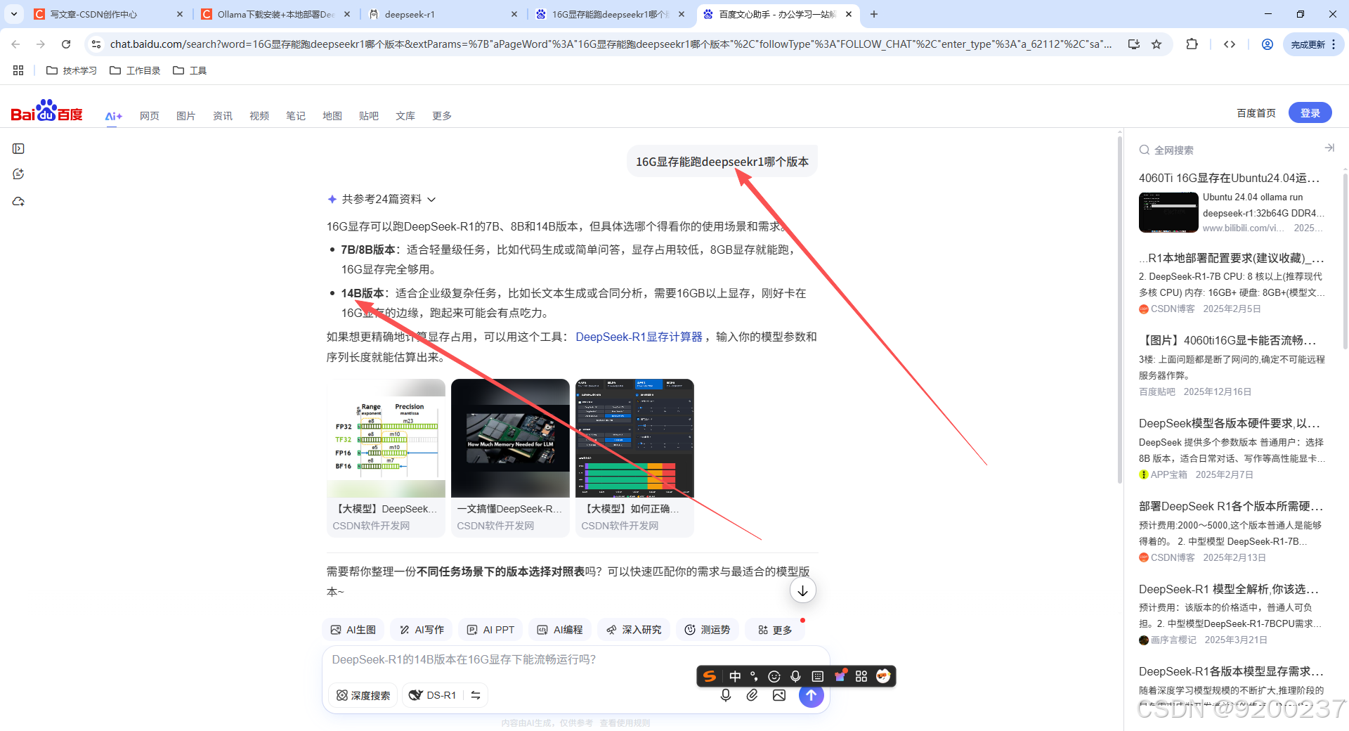 2、进入deepseekr1模型列表后,根据自己电脑的显存大小,匹配去找合适的模型大小点进去。可以用百度ai搜索一下自己的显存适合多大的模型文件。