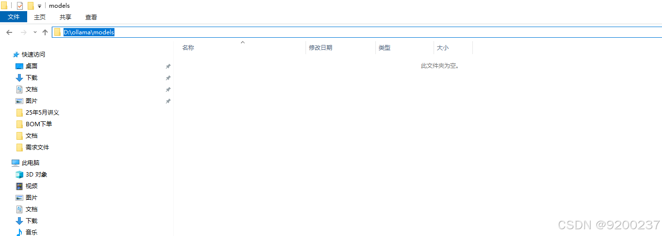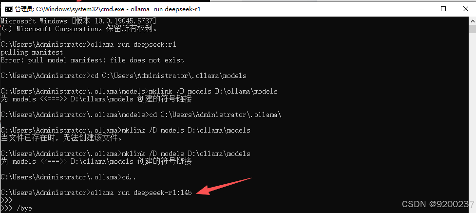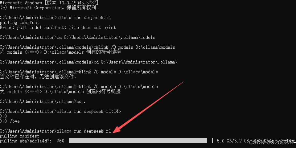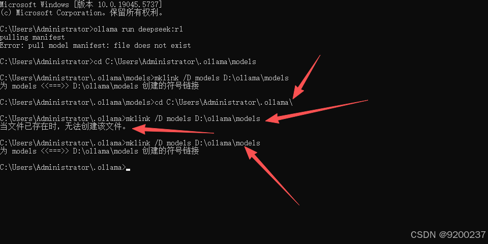 然后输入命令,创建目录映射链接:mklink /D models D:\ollama\models