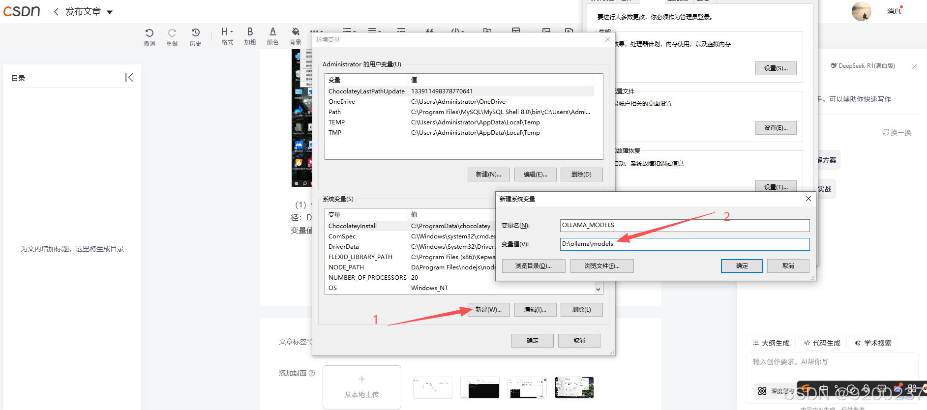 直接在Ollama安装路径下创建了一个models文件夹作为存储路径:D:\ollama\models;然后在系统变量栏,新建一个变量,变量名为:OLLAMA_MODELS