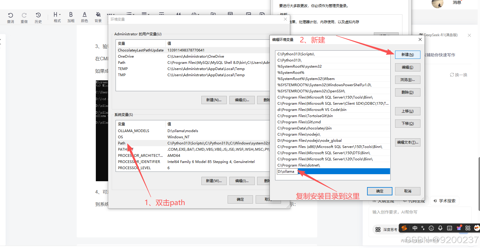 到系统变量下面的 path节点中双击打开,然后在path下面新建一个ollama运行目录。如下图所示: