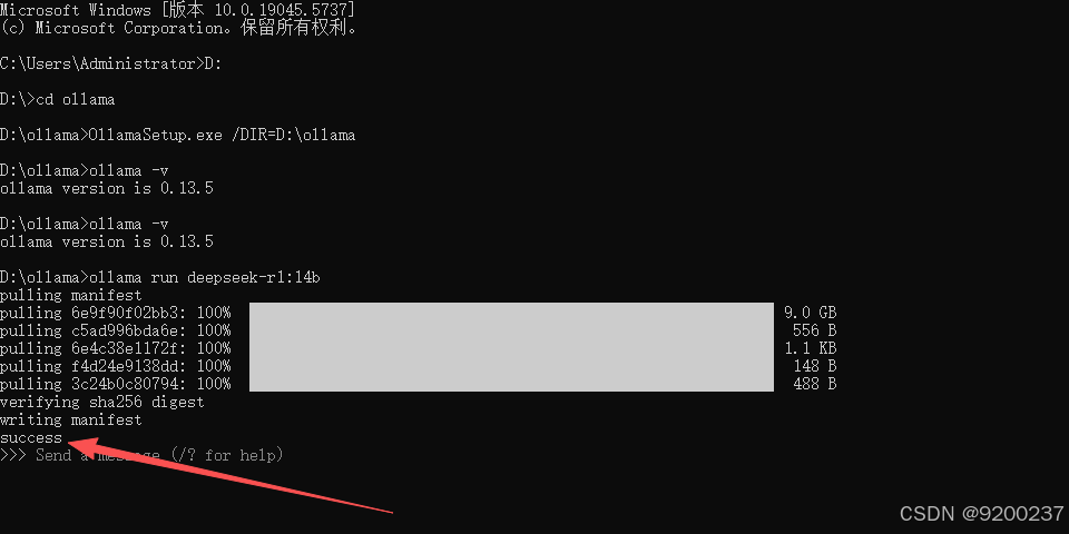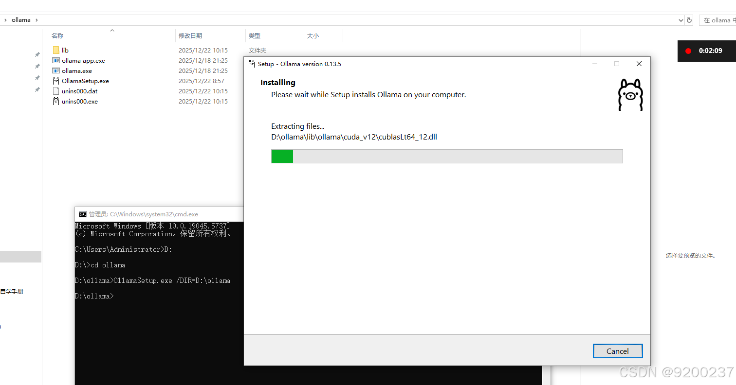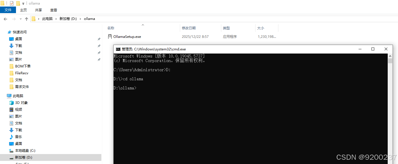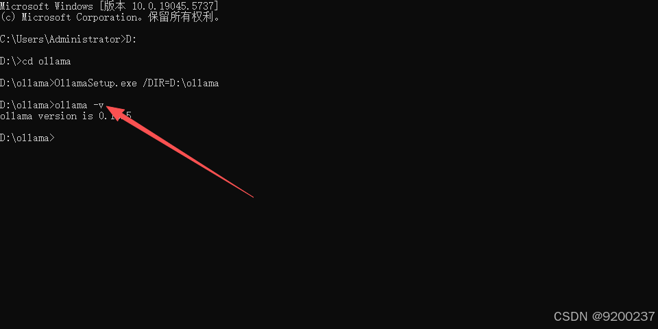 4、CMD窗口输入安装指令:OllamaSetup.exe /DIR=D:\ollama