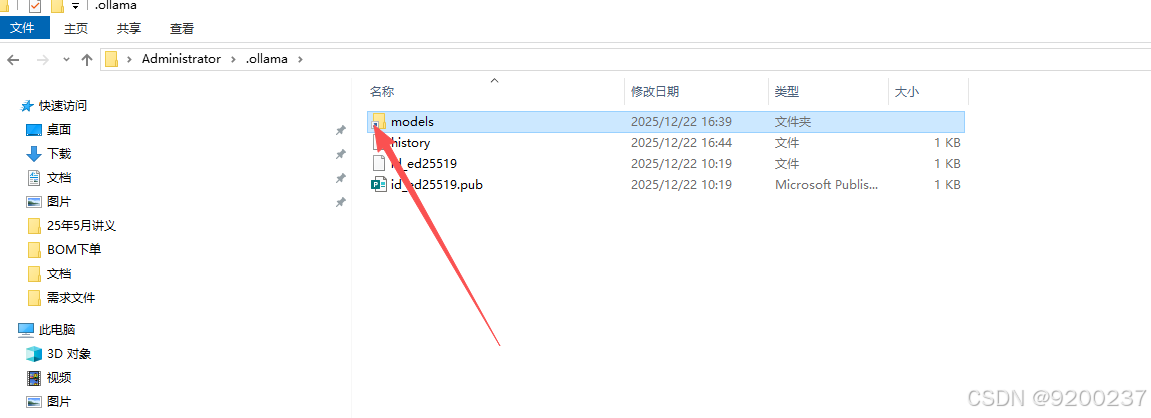 Ollama 下载的大模型默认是放在你系统用户目录下的 .ollama/models 文件夹里,比如在 Windows 上就是 C:\Users\你的用户名\.ollama\models。我们到这里去找。