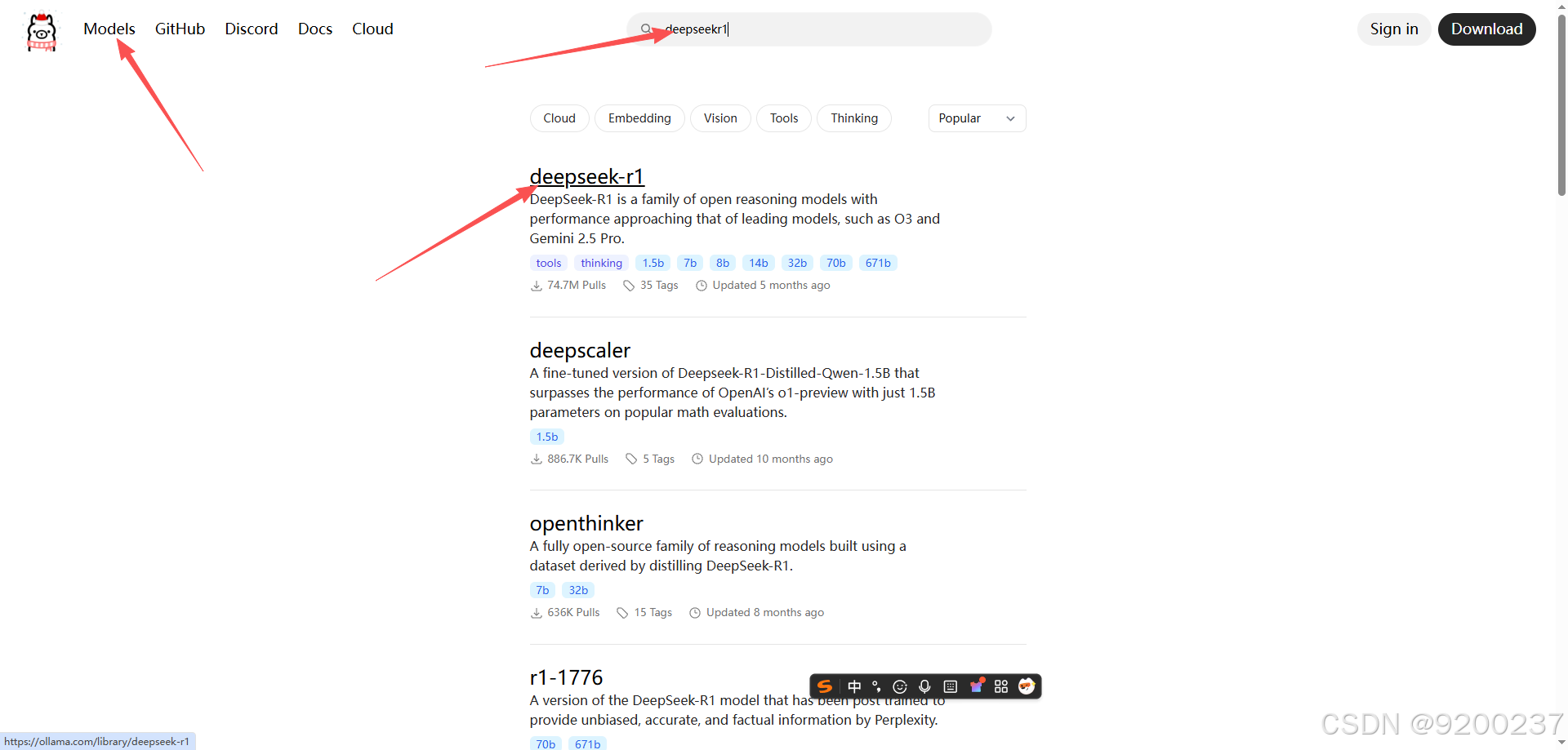 1、进入官网的模型链接中 https://ollama.com/search。搜索deepseekr1
