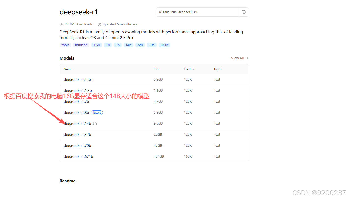 注意,运行大模型时,要指定安装的模型大小(小版本号),不然可能会给你安装一个默认的,比如你输入:ollama run deepseek-r1,他可能给你安装deepseek的默认版本5G的那个。