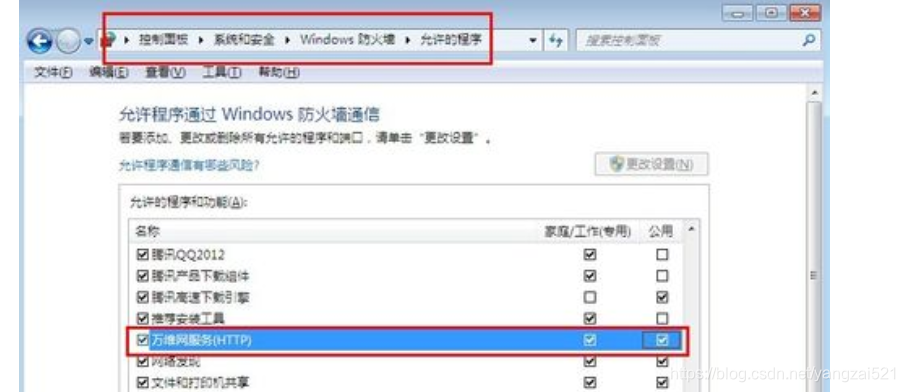 3、设置防火墙,让局域网内其它计算机也能访问本地网站。具体方法:打开控制面板, “系统和安全”,点击“允许程序通过Windows防火墙”,在弹出的对话框中勾选“万维网服务HTTP”右侧的两个复选框,最后点击确定。